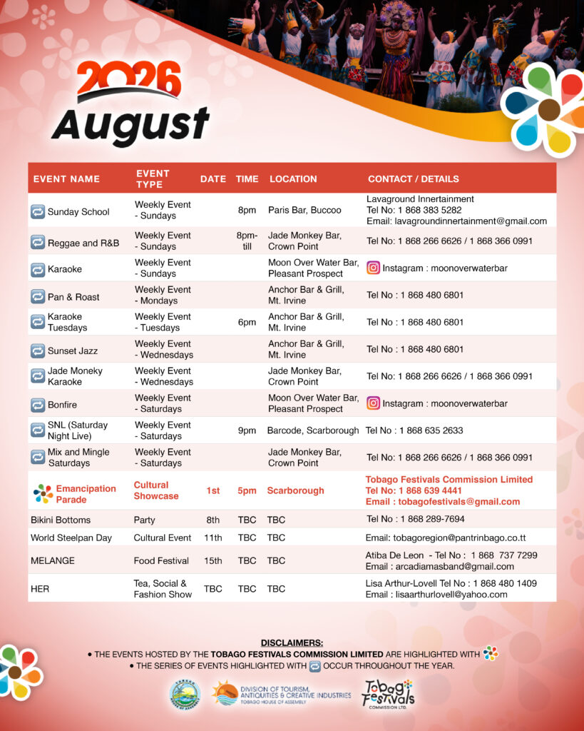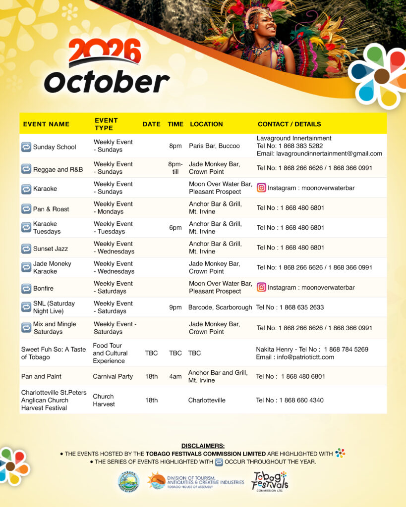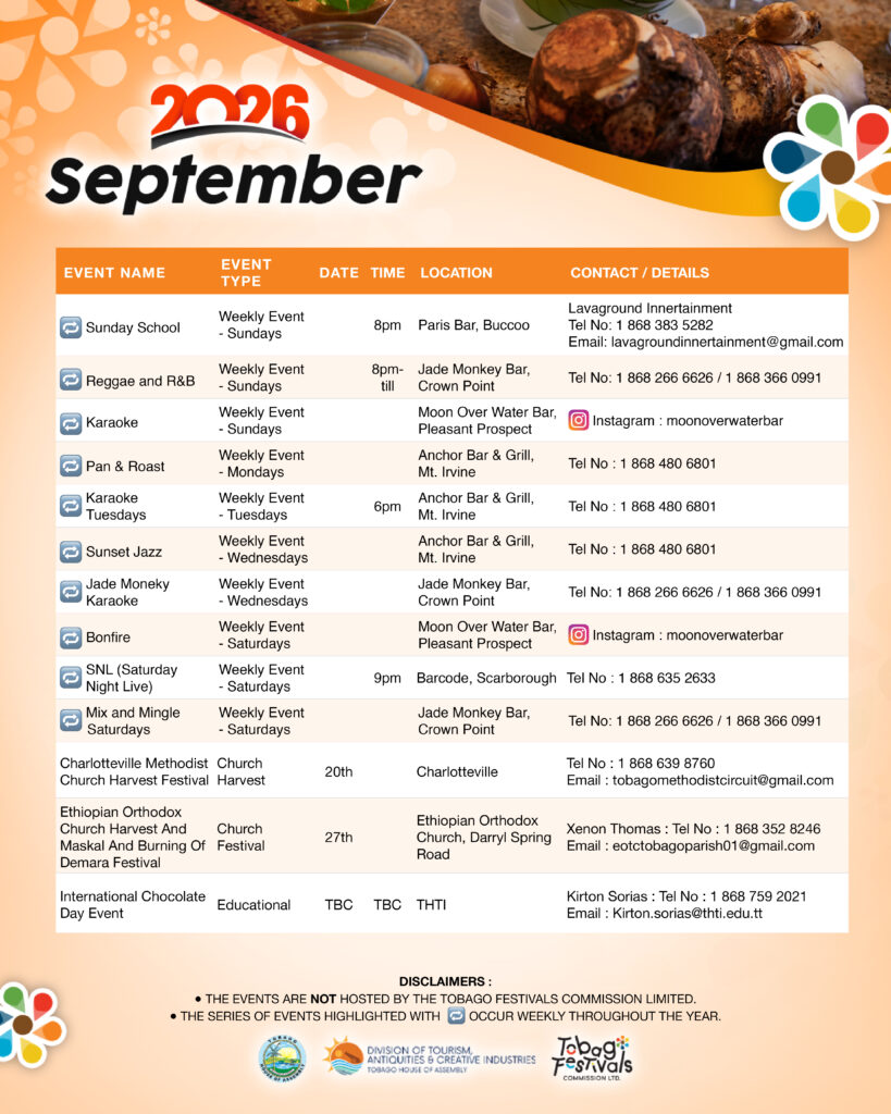 September continues Tobago’s cultural rhythm with village harvest festivals and community gatherings, along with educational events like International Chocolate Day celebrations. Click here for full September event listing.