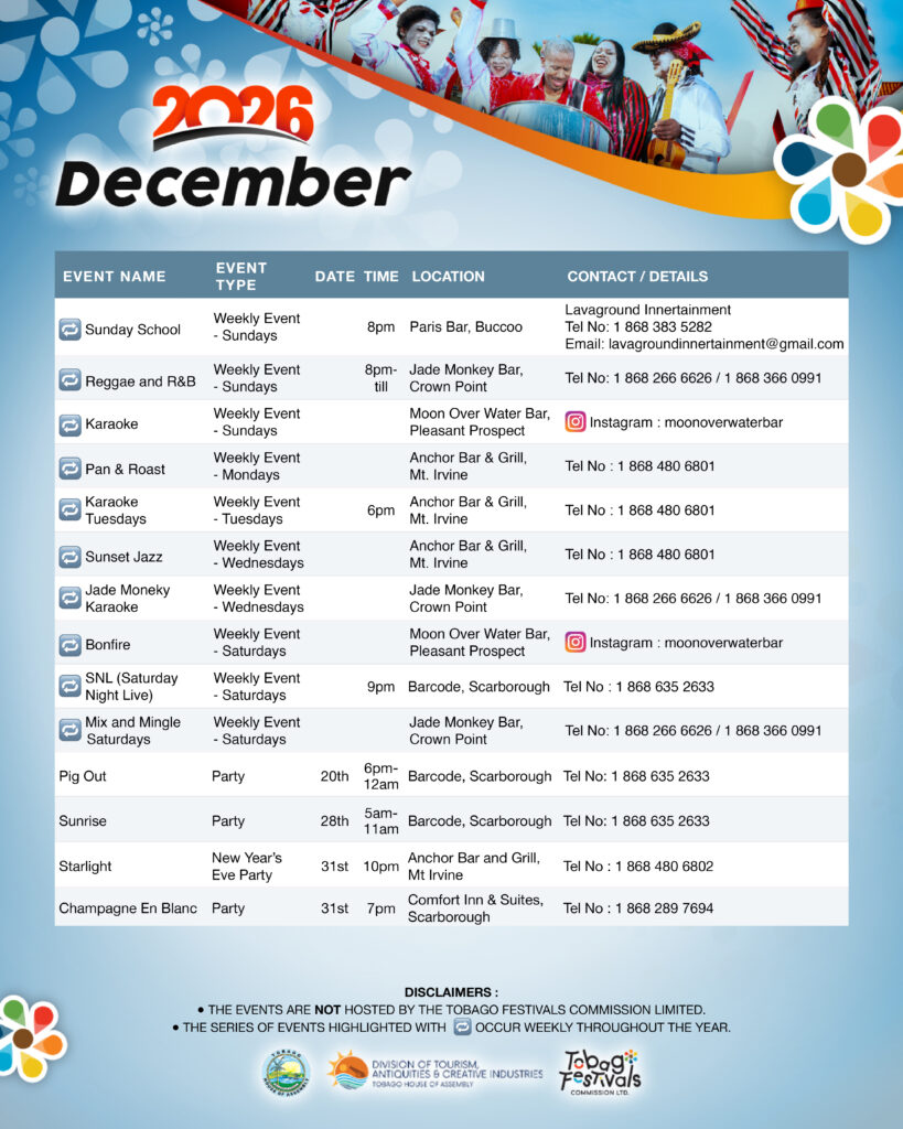 December closes the year with festive celebrations including Starlight New Year’s Eve Party, Champagne En Blanc, and lively holiday events across Tobago. Click here for full December event listing.