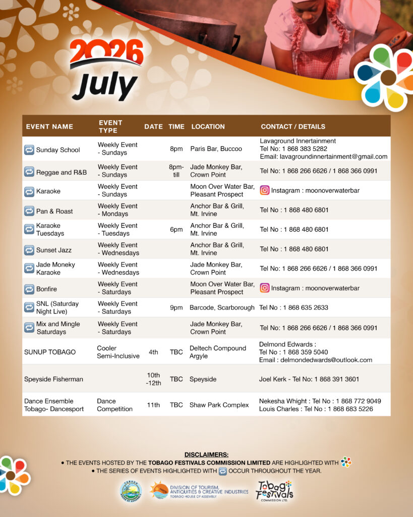 July marks the beginning of Tobago’s rich cultural season with the launch of the Tobago Heritage Festival, alongside community harvests and cultural performances across the island. Click here for full July event listing.