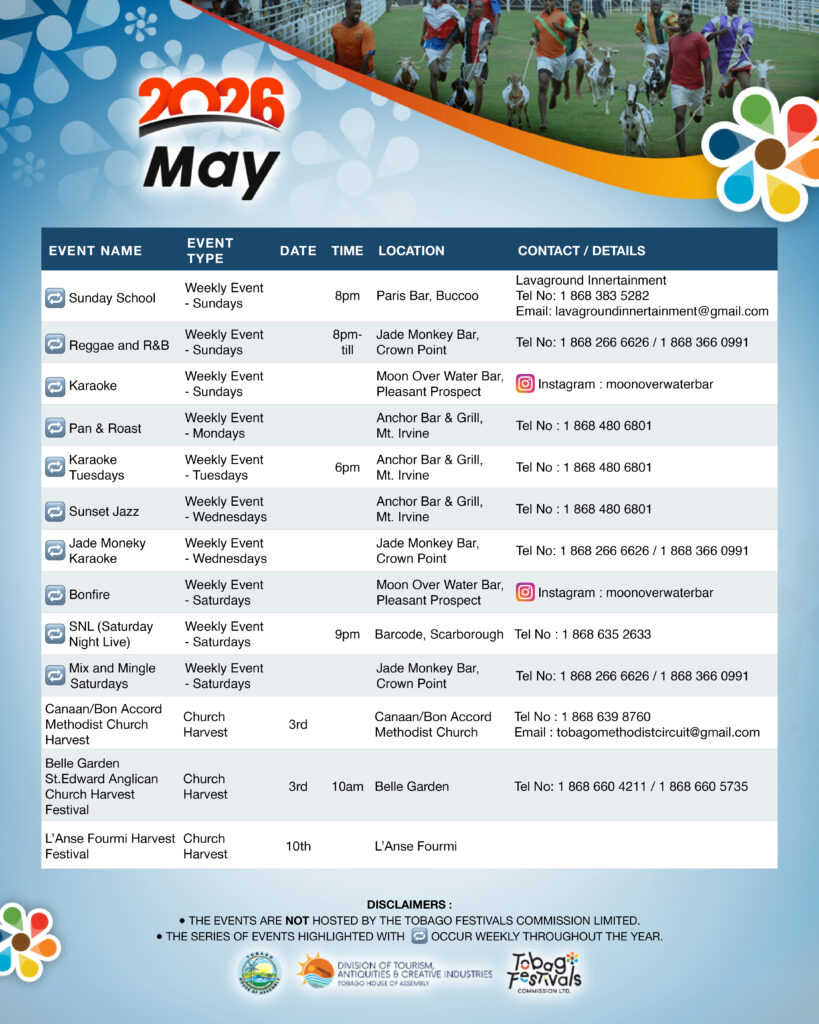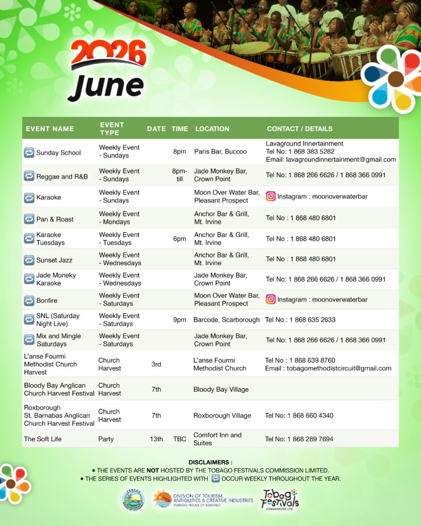 May brings community spirit to the forefront with village harvest festivals such as Whim St. Michael Anglican Harvestand Delaford St. Paul Anglican Harvest, alongside Tobago’s vibrant weekend nightlife scene. Click here for full May event listing.