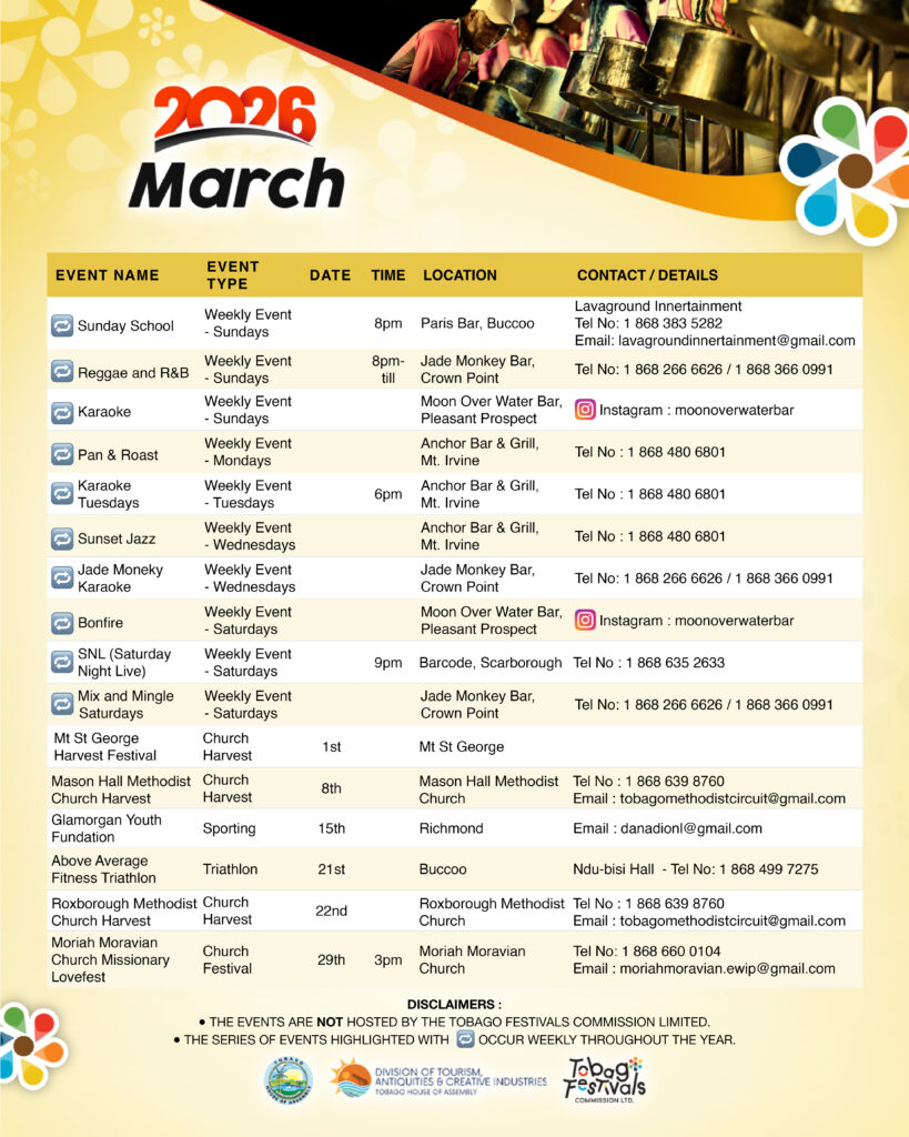 March blends community celebrations and sporting energy with harvest festivals, a triathlon challenge, and youth activities, alongside Tobago’s lively weekly nightlife scene. Click here for full March event listing.