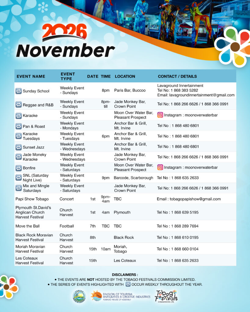October bursts with flavour and festival energy with the iconic Tobago Blue Food Festival and the 5th anniversary of the Tobago Carnival, bringing music, culture, and culinary experiences to the island. Click here for full October event listing.